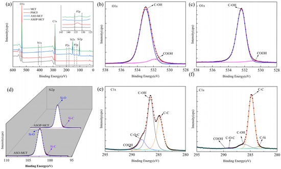 The C1s spectra of MCF and ASOP-MCF are presented in Figure 4e and f, respectively. The C1s spectrum of MCF was divided into four characteristic peaks at 284.8, 286.5, 288.2, and 289.4 eV, responding for C-C, C-OH, C-O-C, and COOH groups, respectively, as shown in Figure 4e. With the abundant -OH groups on the fiber structure, the area of C-OH was larger than all the other peaks [36,37,38]. Compared to MCF, the intensity of the COOH bond of PMCF increased (Figure S1b), which was due to the partial oxidation of MCF. The samples modified by ASO appeared at a new peak at 283.3 eV, owing to the production of the C-Si bond between the MCF and ASO solution [37], as depicted in Figure 4f and Figure S1c.