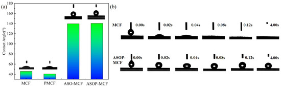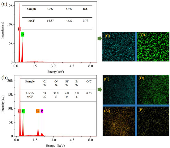 Figure 6 showed that C was the most abundant element in the tested samples, accounting for more than 50%. Within that, MCF only contained C and O elements without P and Si elements (Figure 6a). There were large amounts of P and Si elements in ASOP-MCF with percentages of 4.80% and 2.88%, respectively, and it completely covered the surface of the sample (Figure 6b). Besides, the O/C of ASOP-MCF was lower than MCF, demonstrating the lower polarity and better hydrophobicity of ASOP-MCF, which coincided with the results of the contact angle test.