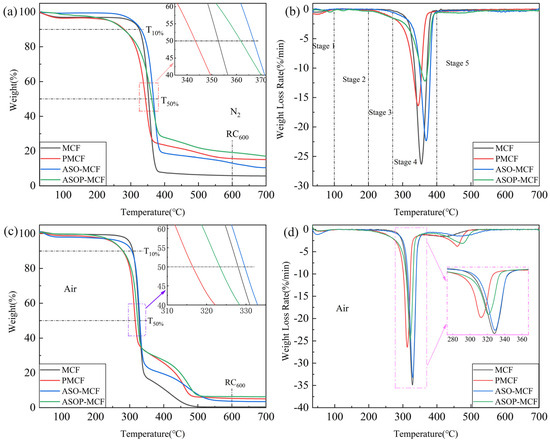 The whole thermal degradation and thermo-oxidative processes of MCF under N2 and air were described by TG and DTG (Figure 7). The decomposition of microcellulose in the N2 atmosphere occurs in one of the main losses that can be categorized into low and high temperatures. At a lower temperature, the glycosyl units decompose into char. Conversely, at higher temperatures, these units depolymerize into volatile products [40]. Figure 7a,b shows that the thermal stability of the samples could be divided into five stages: the first stage is 0–100 °C, caused by the evaporation of adsorbed water in the samples; The second stage is 100–200 °C, where the samples produce little decomposition and are thermal stability; The third stage is 200–270 °C, in which thermal degradation of small molecules (phosphorus-containing groups); And the fourth stage is 270–400 °C, which is the main decomposition stage, the weight loss degradation rate of samples is over 50%. There is an obvious degradation peak on the DTG curve, and the decomposition rate of microcellulose also reaches the maximum, as shown in Figure 7b. The fifth stage is 400–700 °C, and the thermal decomposition is basically finished here, with a lower weight loss rate. The detailed data referring to TG in nitrogen and air were collected in Table 2.