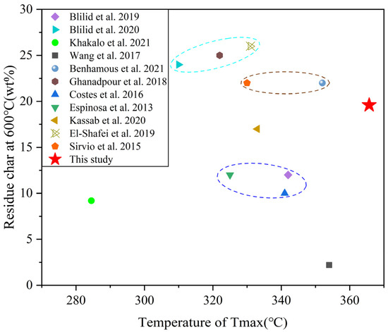 In order to investigate the thermal stability of ASOP-MCF, we have summarized the thermal stability of phosphorylated cellulose in this work and in the literature. As shown in Figure 10, the present work have a larger Tmax and a comparable residual char, compared to other results in the literature, indicating that ASOP-MCF had a better thermal stability and char formation capability.