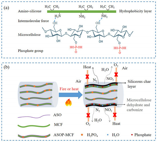 The ASOP hybrid modification mechanism is shown in Figure 11a. Firstly, microcellulose adsorbs ASO on the surface through intermolecular forces. During the adsorption process, the hydroxyl group on the surface of microcellulose interacted with the amino group in the ASO molecule to form two kinds of hydrogen bonds of -O-H---N and -N-H---O, and the hydrophobic alkyl group of the amino silicone oil molecular chain tend to protrude outward [29]. Consequently, the hydrophobicity of microcellulose is enhanced. Secondly, during the process of phosphorylation modification, the phosphate group would replace the free hydroxyl group on the surface of microcellulose, thereby introducing the phosphate functional group on its surface, resulting in the enhancement of the flame-retardant ability of fibers. Therefore, the ASOP hybrid modification not only improves the interfacial compatibility between MCF and polymer but also enhances the flame retardancy of microcellulose fibers.