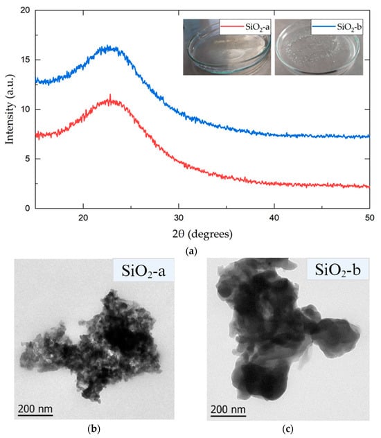 The diffractograms (see Figure 1a) show the typical broad signal generated by an amorphous material, corresponding to silica-based nanomaterials. This result is commonly observed in materials synthesized through the sol-gel process [29]. Both systems presented a wide Bragg reflection between 20° and 30°, with maximum intensities at 22.84° (SiO2-a) and 22.52° (SiO2-b). The TEM images of both the SiO2-a and SiO2-b particles (Figure 1b,c) show a high degree of agglomeration. However, there were significant differences in the particle size within the observed clusters. The SiO2-a particles, synthesized under acidic conditions, exhibited a smaller particle size and a lower agglomeration than those in SiO2-b, as previously reported [15].
