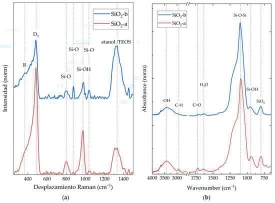 Figure 2a shows the Raman spectra obtained for SiO2 particles. Six characteristic Raman-active vibrational modes were identified for both synthesis methods. R (380 cm−1) represents the flexion mode of oxygen atoms in Si-O-Si linkages, and D1 (484 cm−1) corresponds to the “breathing” relaxation mode of 4-member rings. The mode at 802 cm−1 is the vibration mode of the SiO2 network optical branch, while the 876 cm−1 is the contraction mode of Si-O-Si systems in the SiO2 network. The signal at 976 cm−1 corresponds to the vibration mode of the Si-OH molecule related to the surface silicon atoms. Finally, at 1041 cm−1, a stretching mode belonging to the Si-O-Si core bonds was observed [30]. The SiO2-a sample exhibited higher intensity in the six vibrational modes compared to the SiO2-b system. This may be attributed to a smaller particle size and a lower degree of agglomeration, as observed in the TEM images. This results in a larger surface area, which in turn leads to a stronger interaction with the Raman laser beam [31,32].