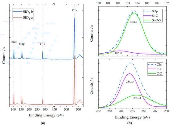In the XPS spectra, the presence of atomic orbitals belonging to Si and O was determined, both associated with the silica (SiO2) structure, as reported in [36]. These systems presented Si:O atomic ratios of 1:1.54 (SiO2-a) and 1:1.44 (SiO2-b). Additionally, the presence of characteristic carbon orbitals (C1s) was observed, with a higher concentration in the SiO2-b samples. The evidence of these chemical species could correspond to precursors’ remnants (acetone and TEOS) and by-products of hydrolysis and condensation reactions (ethanol) [37].