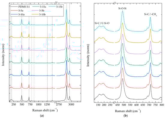 Raman spectra of PDMS 5:1 composite with different NPs SiO2 concentrations (5%, 10%, and 15%). (a) Survey spectra and (b) 145–800 cm−1 zoom in.