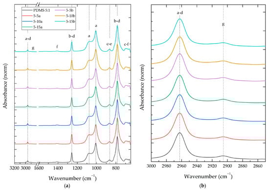Figure 5 shows the FT-IR spectrum of the PDMS 5:1-%SiO2 composite group. This group had a weight ratio of 5:1 (PDMS:TEOS) and normalized intensities. The remaining 14 FT-IR spectra of the study groups and PDMS, TEOS, and DBTDL reference spectra can be consulted in Figure S3. Table 3 displays the vibration wavelength of infrared-active characteristic bonds from crosslinked PDMS composites [41], along with their relative intensity and composites´ intensity shifts because of SiO2 nanoparticles (a and b) at theoretical weight concentrations of 5%, 10%, and 15%.