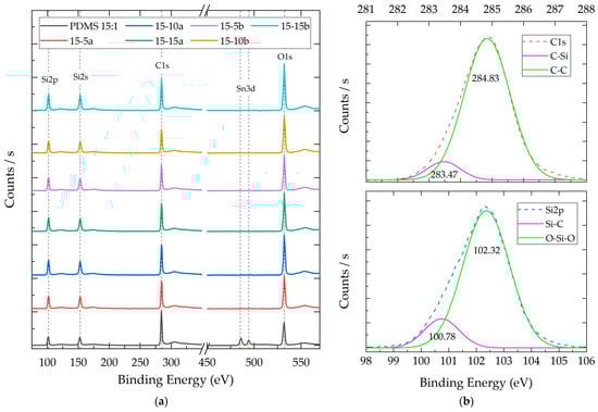 (a) Representative XPS survey spectra of composites with a 15:1 weight ratio (PDMS:TEOS) and different NP SiO2 concentrations (5%, 10%, and 15%). (b) Representative deconvolution analysis for Si2p and C1 orbitals in PDMS 15:1–10% SiO2-a.