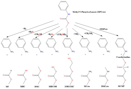 The studied molecular termination reactions of urethane bond using methyl N-phenylcarbamate (MPCate) as proxy. The abbreviation of the products are as follows: methyl formate (MF), methyl hydrogen carbonate (MHC), dimethyl carbonate (DMC), methyl hydrogen carbonoperoxoate (MHCOH), 2-hydroxyethyl methyl carbonate (2OH-EMC), methyl carbamate (MCate), dimethyl carbamate (DMCate), (methyl carbonic) (methyl phosphonic) anhydride (MCMP).