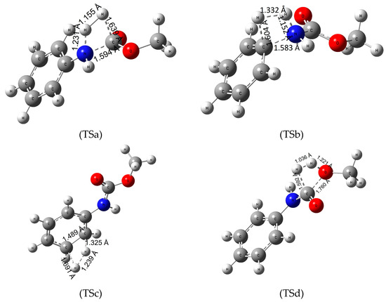 Transition state (TS) structures of the various hydrogenation pathways (TSa—hydrogeantion of the amide bond, TSb—hydrogenation of the C-N bond between the phenyl ring and the nitrogen, TSc—hydrogenation of the π-bond of the phenyl ring and TSd—hydrogenation of the C-O bond) of methyl N-phenylcarbamate (MPCate) as a proxy for the transformation of polyurethanes. The critical parameters (in Å) were obtained at B3LYP/6-31G(d) level of theory.
