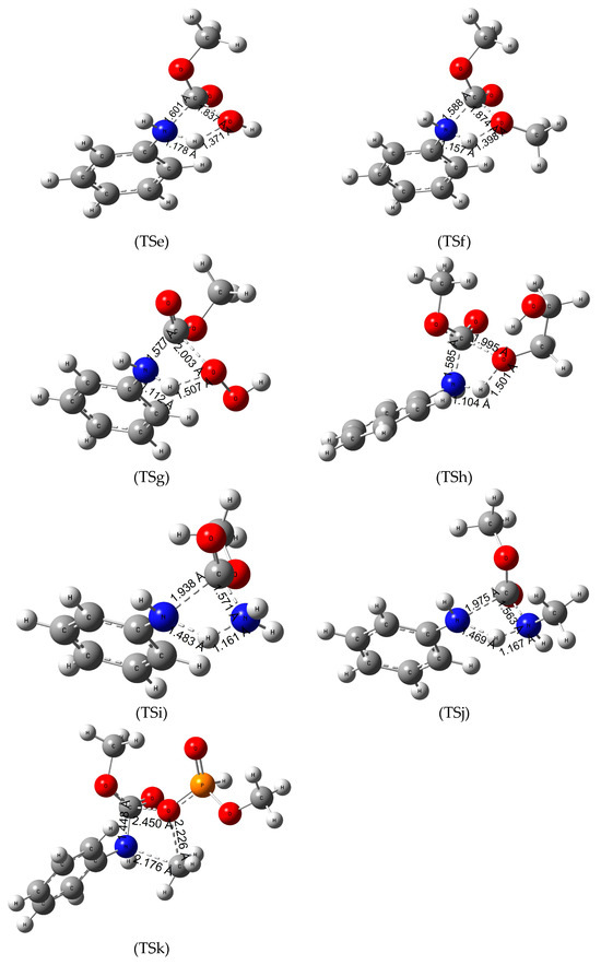 Transition state (TS) structures and the critical parameters (in Å) of termination reactions of MPCate by various chemicals TSe—hydrolysis, TSf—methanolysis, TSg—hydroperoxidation, TSh—glycolysis, TSi—ammonolysis, TSj—aminolysis, TSk—phosphorolysis obtained at B3LYP/6-31G(d) level of theory.