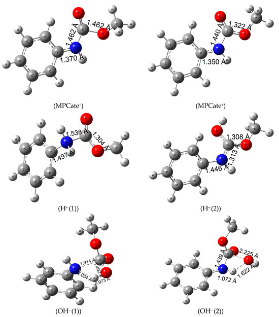 Ionization of the urethane linkage can be a potential alternative of the molecular termination, considering that ionizing radiation of polymers causes crosslinking, scissoring or chain branching [53]. First, the gas-phase electron affinity (MPCate−) of the molecule was calculated (Eea of 99.2 kJ/mol, in Table S8, see Supporting Information) which corresponds to ΔR;298.15KG0 of 95.0 kJ/mol in Table 4. The latter quantity significantly reduced with the inclusion of solvents, especially water (a reduction of 211 kJ/mol can be observed). In terms of structural changes, it can be said that the planar molecule gets slightly distorted, and the amide bond length increases about 0.1 Å. As a second method, ionization energy of the urethane (MPCate+) had been examined. A high energy barrier can be observed with a high solvent effect (reduction in ionization energy of 195 kJ/mol in aqueous solution). Just like in the case of negative ionization, the amide bond length of the molecule increased; however, the negatively charged MPCate has a more favorable energy profile. Protonation of MPCate had been explored in two places of the molecule (attack at N, H+(1) and attack at O, H+(2) see Figure 4). The first path, the protonation of nitrogen, is endergonic (ΔR;298.15KG0 of 38.7 kJ/mol in the aqueous solution), while increasing the bond lengths of both the amide bond and the bond between the benzene ring and the nitrogen. The second pathway, the protonation of the oxo group has a higher reaction Gibbs free energy in water (152.3 kJ/mol) (Table 4). Increase of temperature had a minimal effect on the former protonation method, but protonation of the oxo group (H+(2)) reached a significant reduction in the reaction energies thus becoming more feasible in water. Bond length between the C-atom of the benzene ring and the nitrogen did not increase as much as in the previous method (1.446 Å compared to 1.497 Å of the first protonation method), while the amide bond length narrows down to 1.313 Å.
