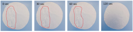 As observed in Figure 1 and Video S1 of the Supplementary Materials, the cut region of the dog bone-shaped film starts to reattach with the rest of the film from the first seconds. Resealing is evident after 60 s, while after 120 s, the film has fully resealed and returned to its original state. It should be stated that such self-healing properties are reported for the first time for such PLA/TECx composite materials. In advance, as observed in Video S2, the obtained self-healing mechanism in such PLA/TECx composite films is thermos-responsive [43].