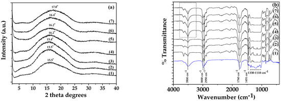 In Figure 2, the XRD (Figure 2a) and FTIR (Figure 2b) plots of all obtained PLA/TECx films as well as pure PLA films are shown for comparison.