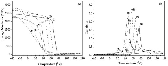 (a) Storage modulus and (b) tan delta plots as a function of the temperature of (1) PLA, (2) PLA/TEC0.2, (3) PLA/TEC0.4, (4) PLA/TEC0.6, (5) PLA/TEC0.8, (6) PLA/TEC1.0, and (7) PLA/TEC1.2 obtained films.