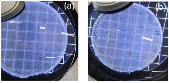 The experimental procedure that followed was based on the agar diffusion method described by Giannakas et al. [35], with some slight modifications of the original protocol given by Barmpaki et al. [38]. Briefly, a final concentration of approximately 1.5 × 108 CFU/mL (i.e., 0.5 McFarland standard) per bacterial strain was achieved in 3 mL of 0.85% peptone salt solution or maximum recovery diluent (MRD; Merck). The suspended bacteria in MRD were inoculated on Mueller–Hinton (MH) agar (Oxoid, Basingstoke, UK) plates with the help of sterile cotton applicators (Jiangsu Kangjin Medical Instrument Co., Taizhou, China) and samples of the PLA/TEC composite films with a diameter of 6 mm were placed onto the surface of MH agar. Then, incubation of the inoculated MH agar plates seeded with the sample composite films took place at 37 °C for 18–24 h. The diameters of inhibition zones in the contact area of the films and around them, if applicable, were measured using a Vernier caliper with 0.1 mm accuracy. The experimental procedure was repeated twice, and films were measured in triplicate in each repetition.