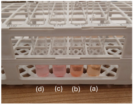 Representative TBA color changes for lipid oxidation experiment of pork fillet wrapped with PLA/TEC0.6 film during (a) day 0, (b) day 2, (c) day 4, and (d) day 6 of storage.