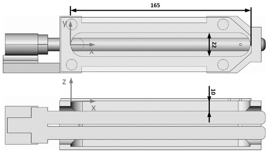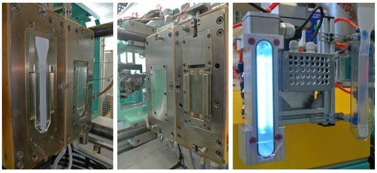 The used UVC lamps were ozone-generating (λ = 254 nm and λ = 185, type 11W-215ozon) and non-ozone-generating (λ = 254 nm, type 11W-215ozon) low-pressure mercury lamps from Dinies Technologies GmbH (Villingendorf, Germany). These lamps were integrated into the robot-handling system, according to Figure 3. Thus, the irradiation distance was 10 mm, and the UVC lamps could reach the polycarbonate surface in a window of 22 mm × 165 mm. The irradiation time was varied by a programmable output (24 V DC) that controlled a relay (230 V AC) on the injection molding machine.