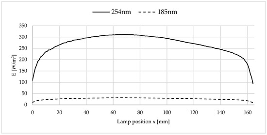 The irradiation conditions resulted in the irradiance curve shown in Figure 4. The lamp intensity was measured using a SI1 radiometer from uv-technik Speziallampen GmbH (Ilmenau, Germany). The radiometer is calibrated to the wavelength of 254 nm specified by the manufacturer. The wavelength of 185 nm is specified by the lamp manufacturer as 10% of the value at 254 nm. Thus, the wavelength of 185 nm was emitted during irradiation with ozone-generating lamps, but not when using non-ozone-generating lamps.
