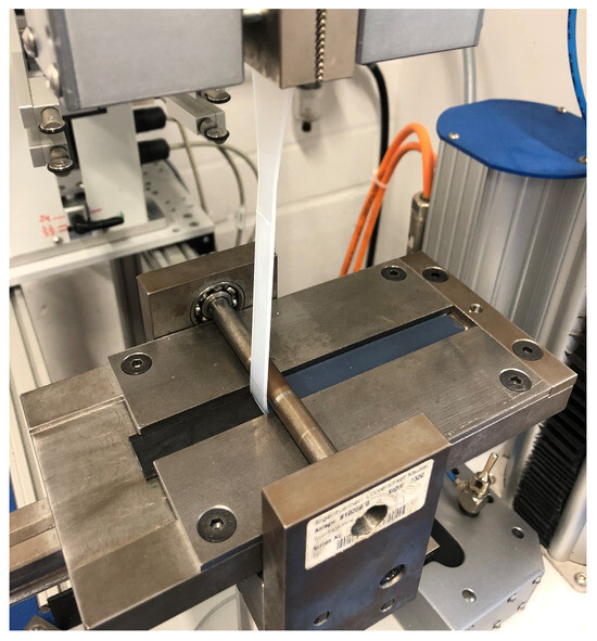 When carrying out the peel test, the test specimen (Figure 1) was first fixed in a sled, which was mounted horizontally with low friction. Secondly, the soft component was clamped in the jaws of a tensile testing machine after passing a deflection roller. Then, the LSR component was peeled from the substrate at a defined speed of 100 mm/min, and the force required for delamination was recorded (Figure 5). The peel resistance W [N/mm] as a characteristic value for adhesion was calculated as the quotient of the peel force (F) by the adhesion line (20 mm).
