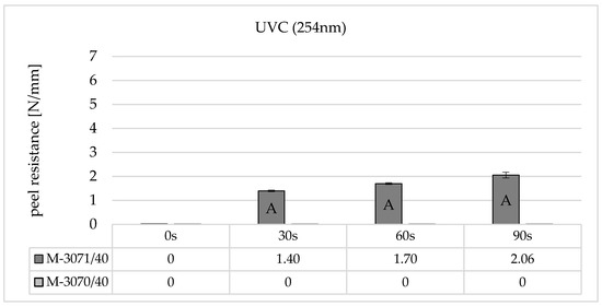 Peel resistance for Wacker Elastosil® LR 3070/40 and LR 3071/40 on Covestro Makrolon® 2405 (M) for different irradiation times using a non-ozone-generating low-pressure mercury lamp (main emission wavelength at 254 nm), standard deviation (SD) for n = 3, failure mode with letters, cf. Section 2.4.