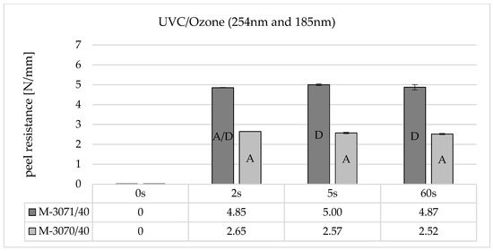 Peel resistance for Wacker Elastosil® LR 3070/40 and LR 3071/40 on Covestro Makrolon® 2405 (M) for different irradiation times using a non-ozone-generating low-pressure mercury lamp (main emission wavelength at 254 nm and 185 nm), SD for n = 3, failure mode with letters, cf. Section 2.4.