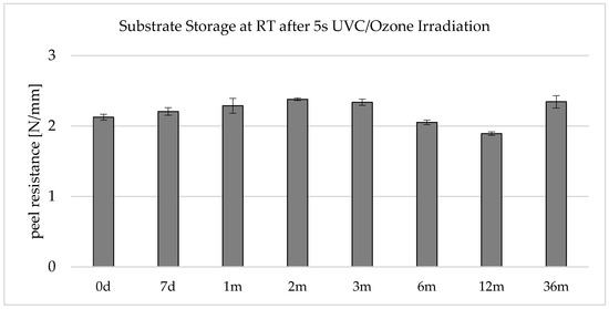 Figure 6 shows the results of peel resistance for two different self-adhesive LSR types on BPA polycarbonate Makrolon® 2405 from Covestro (Leverkusen, Germany) and increasing irradiation times for non-ozone-generating UVC irradiation (254 nm).