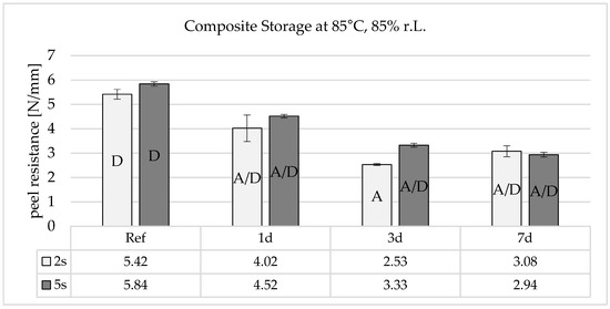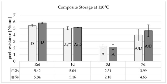 Figure 9 shows that composite storage at 120 °C leads to a slight drop in adhesion after one day. After three days, the adhesion reaches a minimum and then rises again to almost the initial peel resistance after 7 days.