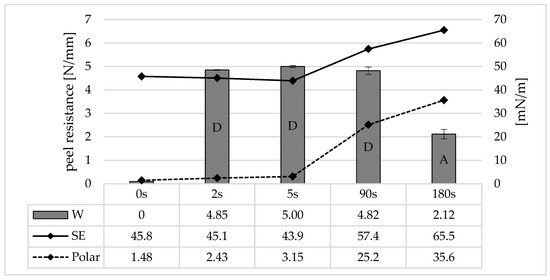 Peel resistance (columns, “W”) for the material combination Covestro Makrolon® 2405 and Wacker Elastosil® LR 3071/40 and surface free energy (black line, “SE”) and the polar fraction of the surface free energy (dash line, “Polar”) after irradiation of the polycarbonate with an ozone-generating low-pressure mercury lamp (main emission wavelength at 254 nm and 185 nm) for different irradiation times, SD for n = 3, failure mode with letters, cf. Section 2.4.