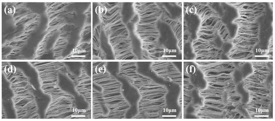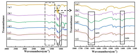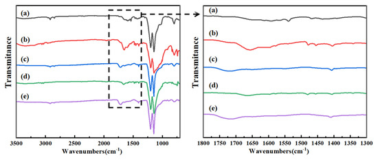 From Figure 2a, it can be seen that the pristine PTFE capillary membrane displayed sharp peaks at 1146 cm−1 and 1201 cm−1, corresponding to the stretching vibration of -CF2 [42]. Observing Figure 2b–f, it was found that the stretching vibration peak of -CF2 weakened, and a new characteristic peak at 1089 cm−1 emerged, attributed to the Si-O-Si bond formed after the hydrolytic condensation of VTES [43]. The adsorption peak at 1655 cm−1 corresponds to the stretching vibration of the C=O bond in the amide group, while the peak at 1420 cm−1 corresponds to the stretching vibration of the C-N bond in the amide group, which corresponded well with the existing literature [42,43]. The results indicated the successful introduction of the amide groups onto the PTFE capillary membranes.