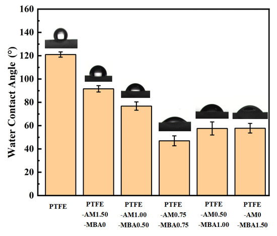 Both AM and MBA contain amide groups which can be introduced into the long-chain molecules generated through free radical polymerization and physically intertwined onto the fiber nodes of the PTFE capillary membrane. The amide groups, as polar groups, improved the wetting properties of the PTFE capillary membrane, enhancing its hydrophilicity. The combined action of free radical polymerization and hydrolytic condensation resulted in the creation of a hydrophilic three-dimensional network, physically intertwined onto the fiber nodes of the PTFE capillary membrane, roughening the originally smooth PTFE surface. An increased surface roughness led to an increased surface area per unit volume. This increase in roughness implies unevenness on the membrane surface, exposing more polar groups to water molecules, thereby enhancing the hydrophilic properties of the PTFE capillary membrane [29,30].