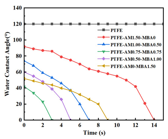 Figure 6 illustrates the change in water contact angle over time for the PTFE capillary membranes before and after hydrophilic modification. The pristine PTFE capillary membrane’s water contact angle remained stable at 120°, indicating consistent hydrophobicity. The water contact angle of the PTFE capillary membrane gradually decreased over time after modifications, eventually allowing complete water infiltration. Among all modified membranes, PTFE-AM0.75-MBA0.75 exhibited the smallest instantaneous water contact angle and the shortest infiltration time, with a contact angle of 42°, achieving complete infiltration within 3 s. This was due to the more intensive hydrophilic three-dimensional network formed as the MBA content in the formulation increased, allowing more hydrophilic groups to physically intertwine on the PTFE capillary membrane and providing the modified membrane with outstanding hydrophilicity. Conversely, for the PTFE-AM0-MBA1.50 sample, despite its notable hydrophilicity, the complete infiltration time was relatively longer, taking 14 s, which was attributed to the pore blockage.