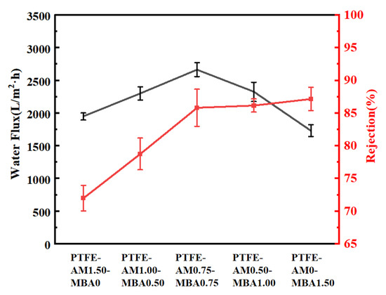 Overall, the water flux of the modified PTFE membranes initially increased and then decreased with the increasing MBA content in the formulation. The increasing trend can be attributed to the higher MBA concentrations favoring the attachment of more hydrophilic groups on the membrane’s fibers and nodes, which can enhance the surface hydrophilicity and increase the pure water flux [39]. However, a further rise in MBA content led to excessive participation in free radical copolymerization, resulting in the formation of an overly dense hydrophilic three-dimensional network. This network excessively aggregated particles on the surface of the PTFE capillary membrane, causing the pore blockage and subsequently reducing the water flux of the modified PTFE capillary membrane despite increased surface roughness.
