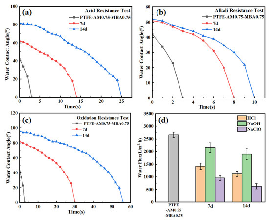 Time-dependent curves of water contact angles of PTFE-AM0.75-MBA0.75, which were treated by immersing in a 3% mass fraction (a) HCl solution, (b) NaOH solution, and (c) NaClO solution for 2 weeks and (d) the change in water flux.