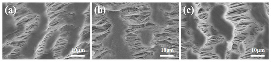 SEM images of PTFE-AM0.75-MBA0.75, which was treated by immersing in a 3% mass fraction (a) HCl solution, (b) NaOH solution, and (c) NaClO solution for 2 weeks.