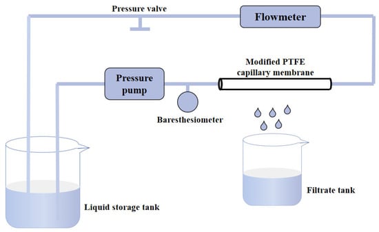 Using a flow filtration system (moist-02hfm, China) shown in Scheme 2, the pure water flux of the PTFE capillary membrane was tested. Before the test, the membrane specimen loaded in the filtration pool was pressurized with deionized water at 0.2 MPa for at least an hour to ensure stable membrane flux. Pure water flux (Jw) was measured using deionized water under a transmembrane pressure of 0.1 MPa, which was calculated using the Formula (1)