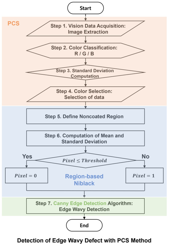 The edge defect detection process employs three distinct methods: PCS, region-based Niblack (RN) thresholding, and Canny edge detection. Figure 3 shows each method using a different color. This process comprises seven specific sequential steps to identify edge coating defects. The flowchart in Figure 3 illustrates the defect detection procedure. The PCS method, covering steps 1–4, entails processing vision image data for data selection. RN thresholding, performed during steps 5 and 6, determines the threshold value for classifying pixels as either white or black. The final step, step 7, involves Canny edge detection to identify edge patterns in the processed images. Steps 1–4 constitute the core process of the proposed approach presented in this study.