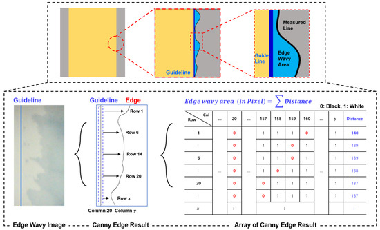 Various edge detection methods exist, such as the Sobel, Prewitt, and Robert Edge methods, which can be used for the detection of edge wave defects. Each method possesses unique characteristics and strengths. The Sobel method is particularly sensitive to diagonal edges and is resistant to noise. However, its effectiveness diminishes in densely or complexly changing contrast regions, making it less suitable for edge defect detection. Similarly, the Prewitt edge detection method shares similarities with the Sobel method but boasts a faster response time. However, compared to the Canny edge method, the edges detected may be less prominent as it is less sensitive to changes in brightness. The Robert Edge method is the fastest among the considered edge detection methods and is capable of reliably extracting edges. However, the edges extracted tend to be thinner and more susceptible to noise compared to other methods. Conversely, the Canny edge algorithm is widely regarded as the most optimized algorithm for determining contours and removing edges associated with noise in the original image. This algorithm excels at extracting strong edges while being relatively insensitive to noise. Therefore, the Canny edge algorithm has been employed due to its ability to detect edges in images accurately while minimizing false positives [40,41,42].
