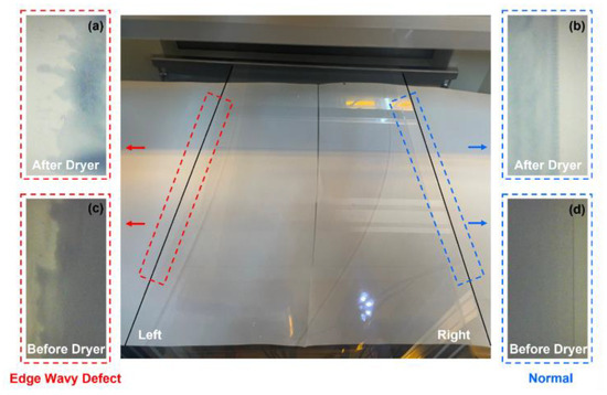 Comparison of the coating structural quality of coatings with and without edge defects. (a) Edge wave defect after dryer. (b) Edge wave defect before dryer. (c) Normal condition after dryer. (d) Normal condition before dryer.