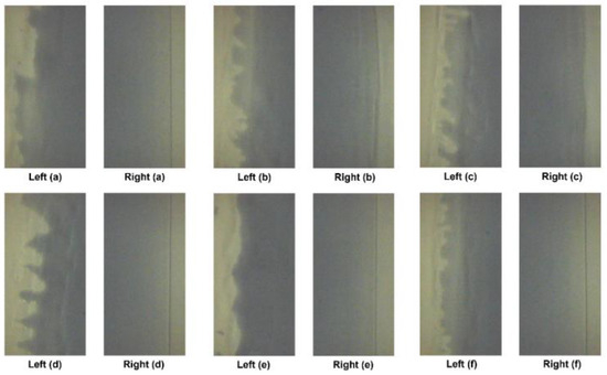 The processing conditions for data acquisition and the specific ink and material that were used during experimentation are listed in Table 1 and Table 2. The coating gap of the processing condition was 0.1 mm, and the flow rate was 4 mL/min. The drying temperature of the dryer was set to 80 °C, while the web speed of the R2R slot-die coating system was set at a speed of 1 m/min. The processing condition of the web tension was 2.7 kgf, the target thickness was 3 mm, and the coating width was 0.12 m. Coating was performed on the web for 20 min. The vision images of the experimental data were acquired over 20 min for 10 trials. The film that was used for acquiring vision images was CH34P. The poly(3,4-ethylenedioxythiophene):polystyrene sulfonate (PEDOT:PSS) + ethanol ink, known for its high working function and conductivity, offers remarkable transmittance and thermal stability. This is extensively applied as an electrode in flexible polymer solar cells and similar devices. Figure 9 and Figure 10 show examples of the images acquired under the processing conditions presented in Table 2. The images labeled “Right” depict coatings with nondefective edges, serving as a reference for direct comparison with coatings exhibiting edge defects. As mentioned earlier, the PCS method was applied to the “After Dryer” samples for comparison with results from the weighted sum method.