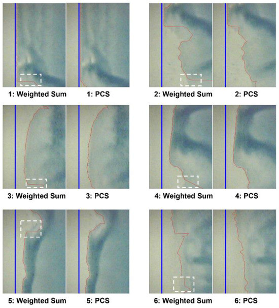 The actual edge area mentioned in (5) was manually determined to assess the detection accuracy of both the PCS and weighted sum methods and validate the results obtained using the two compared methods. The edge wave area obtained using (5) was measured using the methods described in Section 2.