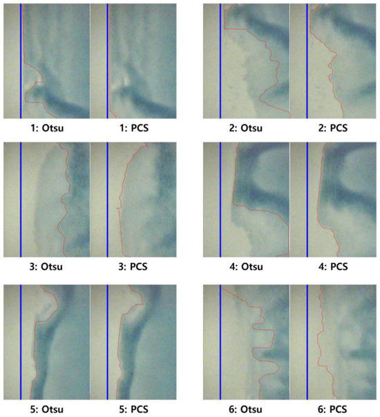 Although the primary focus of the study is to contrast the PCS method with the traditional weighted sum method, an additional experiment was conducted to compare the PCS method with another grayscaling method for verification. Otsu’s method was used as an alternative edge defect detection method in comparison to the PCS method [43,44,45]. The results of this extended comparison are listed in Table 6, alongside the results of the PCS and weighted sum methods. The results reveal an average of 80.7% accuracy for detecting edge areas while performing at a slower processing speed. Otsu’s method shows inconsistent accuracy among the six cases, ranging from 68.2% to 94.2% depending on the condition of the targeted image. Compared to the weighted sum method, even though it shows better performance in terms of time and data capacity consumption, the inconsistency of this method critically affects the defect detection process. The inconsistent results of measuring the edge wave area are shown in Figure 12. This broader evaluation not only highlights the superior performance of the PCS method but also highlights its advantages in edge coating defect detection compared to other prevalent image preprocessing techniques.