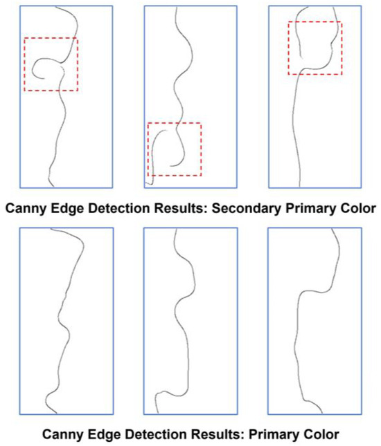 The basis of selecting the optimal color with the PCS method is to derive a higher detection rate than other approaches. The significance of this selection lies not only in the potential reduction of processing time and data capacity but predominantly in the enhancement of detection capabilities. However, opting for secondary or tertiary primary colors may reduce processing time and data capacity, but it may not yield the same increase in detection rate as with primary colors. As shown in Figure 13, the selection of secondary primary color causes the lack of precision and clarity for the Canny edge detection algorithm to differentiate regions. Therefore, once the Canny edge detection algorithm is carried out based on the results of the secondary or tertiary primary color, the outcome of the edge defect detection rate will significantly decrease compared to the primary color results. The results of the defect detection based on secondary and tertiary primary color are shown in Table 7 and Table 8. The priority of the colors aligns with the result of the calculation of standard deviation as mentioned above. The results of secondary and tertiary primary colors show that while maintaining a similar reduction rate compared to the primary color, the accuracy of the edge defect has decreased. It can be seen that the average accuracy of the tertiary primary color is lower than the weighted sum average. Thus, resulting in the optimal primary color is crucial in order to maximize the significant efficiency the proposed PCS method derives.