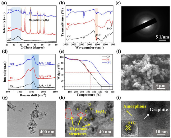 Figure 2 provides a comprehensive analysis of the composition, thermal properties, morphologies, and structures of the core-shell-like composite. In Figure 2a, X-ray diffraction (XRD) reveals broad peaks at 26° and 44°, which are characteristic of carbon materials [19]. This observation is further supported by the FTIR analysis shown in Figure 2b, where a characteristic peak at 1560 cm−1 is consistent with carbonized PNs [20]. The presence of small Fe3O4 NPs (approximately 12 nm) on the FC is confirmed by the characteristic XRD marked peaks and the FTIR peak at 585 cm−1, corresponding to the FeO bond. This functionalization is visualized in Figure S2 (see Supplementary Materials) [21]. Furthermore, Figure 2c displays the selected area electron diffraction (SAED) pattern, which exhibits distinct diffraction ring patterns. This indicates the formation of Fe3O4 nanocrystals with a body-centered cubic (bcc) phase, randomly distributed as a result of carbonization [22]. The response of the samples to a magnet, as shown in Figure S1 (see Supplementary Materials), provides compelling evidence for the presence of Fe3O4 NPs. In Figure 2d, the Raman spectra show an increased intensity ratio of the D band to the G band (D/G ratio) for the FC and CFC. This suggests that the presence of Fe3O4 NPs leads to a catalytic graphitization effect, promoting the formation of graphitic carbon structures in the samples [23,24]. As can be seen in Figure 2e, the thermal stability of FC and CFC samples increased significantly compared with CNs due to rapid double-carbonization and the functionalized Fe3O4 layer on the CN surface. These findings suggest that the synthesized materials have good thermal stability and potential for various applications.