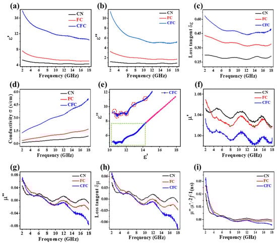 Frequency dependence of (a,b) the complex permittivity and (c) dielectric loss tangent, and (d) conductivity. (e) The ε′–ε″ curve of CFC. (f,g) The complex permeability, (h) magnetic loss tangent, and (i) (μ″(μ′) − 2f − 1) curve.