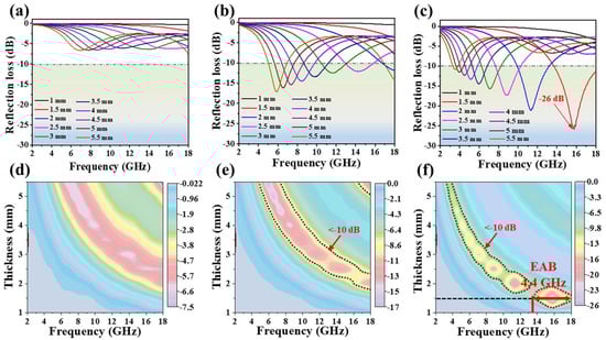 Figure 4 showcases the performance of three different samples (CN, FC, and CFC) across the frequency range of 2–18 GHz with varying thicknesses ranging from 1 to 5 mm. Across various thicknesses, the FC and CFC samples demonstrate a remarkable EMWA performance, achieving an RL value below −10 dB and highlighting their exceptional absorption efficiency (Figure 4b,c,e,f). In contrast, the CN sample exhibits comparatively lower microwave absorption capabilities, as illustrated in Figure 4a,d. Particularly, the CFC sample demonstrates the highest absorption capability, achieving an EAB of 4.4 GHz and RLmin of −26 dB at 16 GHz with a thin thickness of only 1.5 mm (Figure 4c,f). On the other hand, the FC sample achieves an RLmin of −32.7 dB (99.99% dissipation efficiency) at a lower frequency of 2.7 GHz, but it requires a thickness exceeding 10 mm (see Figure S4 in the Supplementary Materials). By comparing Figure 4b,c with Figure S4, it becomes evident that the CFC sample exhibits an EAB of 14.8 GHz (3.2–18 GHz) within the thickness range of 1.5 to 5.5 mm. In contrast, the FC sample demonstrates an EAB of 15.8 GHz (2.2–18 GHz), but within a relatively higher thickness range of 1.5 to 10 mm. Furthermore, the CFC sample displays a maximum EAB of 4.62 GHz, corresponding to an RLmin of −24 dB, at a thickness of only 1.6 mm (Figure 5a). The unique core-shell-like structures, along with various-sized pores and disorder in turbostratic graphite, contribute to a broadened absorption bandwidth, making the composite suitable for broadband EMWA applications. In general, along with their wide EAB and thin thickness advantage, these exceptionally rapid double-carbonized core-shell-like samples offer several advantages compared to earlier findings in the field of EMWA materials (for instance, in [9]), which were prepared using more intricate, energy-intensive, and time-consuming methods.