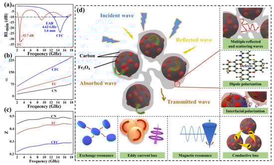Therefore, the attenuation and impedance results shown in Figure 5b,c) align with the observed absorption performance of the CFC. Notably, the CFC demonstrates higher attenuation and lower impedance compared to the other samples, enabling a larger portion of incident waves to be absorbed and simultaneously converted into heat. As a result, the reflection and transmission are reduced, leading to an enhanced absorption efficiency. However, the combination of core-shell-like structures, 3D porosity, carbon defects, and the embedded Fe3O4 NPs results in synergistic electromagnetic loss mechanisms, as illustrated in Figure 5d. These mechanisms collectively enhance the EMWA performance, broaden the absorption range, and facilitate efficient energy dissipation by optimizing the interaction and minimizing reflection and transmission waves.