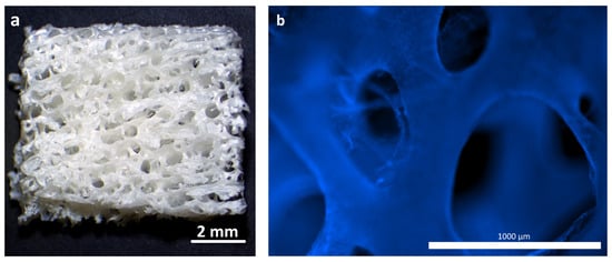 Osteoplastic matrix before starting the study: (a) external view of the sample; (b) porous structure of the sample before the experiment, fluorochrome Hoechst 3334, BD Pharmingen™.