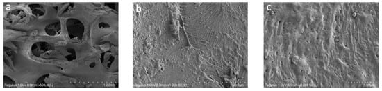 The SEM images of the osteoplastic matrix looked different (Figure 4). It can be seen that the osteoplastic matrix was a structure with interconnected large cavities with a diameter ranging from 100 to 600 µm; the walls of the cavities were more compact compared with those of the hybrid polymer.
