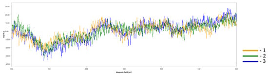 ESR spectra of the empty glass tube: (1) glass tube with a hybrid material sample in air; (2) and under vacuum; (3) Tube diameter 1.5 mm; T = 298 K. Recording parameters: field center B0 = 338 mT (gi~2.0030), sweep value B = 12 mT, modulation value = 0.2 mT.