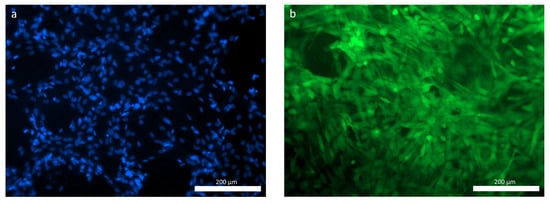 ASCs on the hybrid polymer, 72 h cultivation: (a) cell nuclei stained with fluorochrome: Hoechst 3334, BD Pharmingen™; (b) viable ASCs, cytoplasm stained with Calcein AM fluorochrome (BD Pharmingen™).